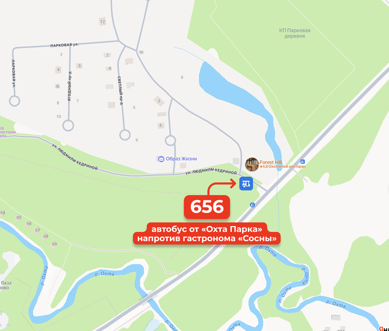 От м. Парнас Пр. Энгельса → Корабсельки → д. Энколово → Охта Парк
