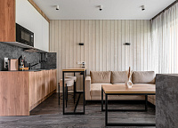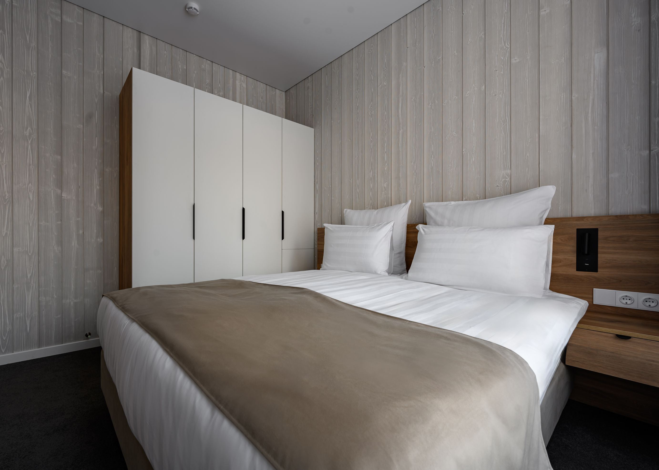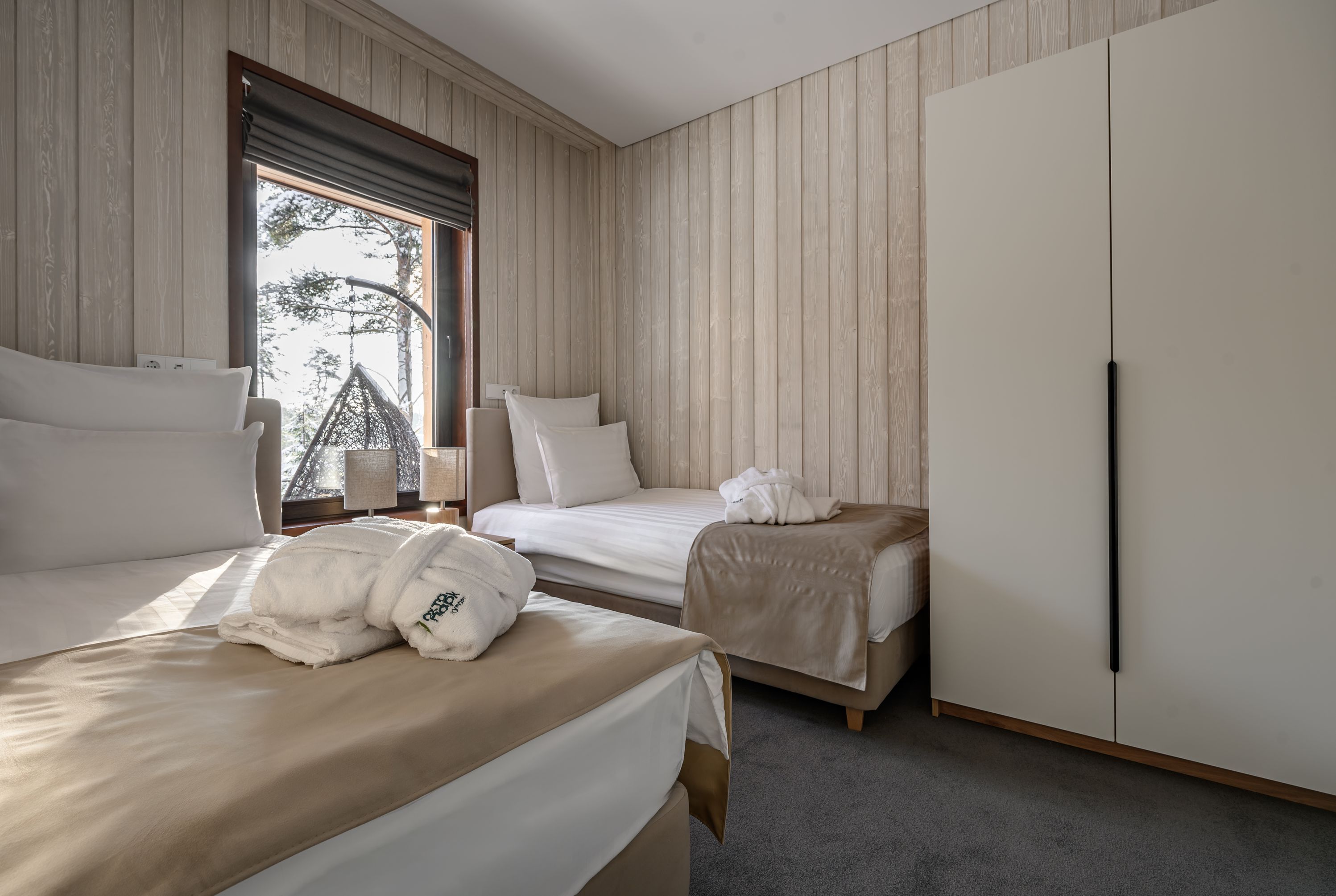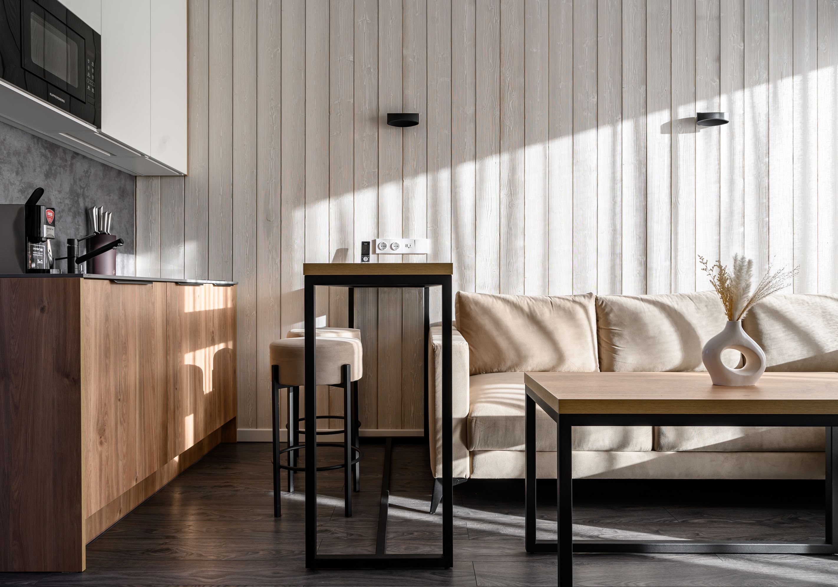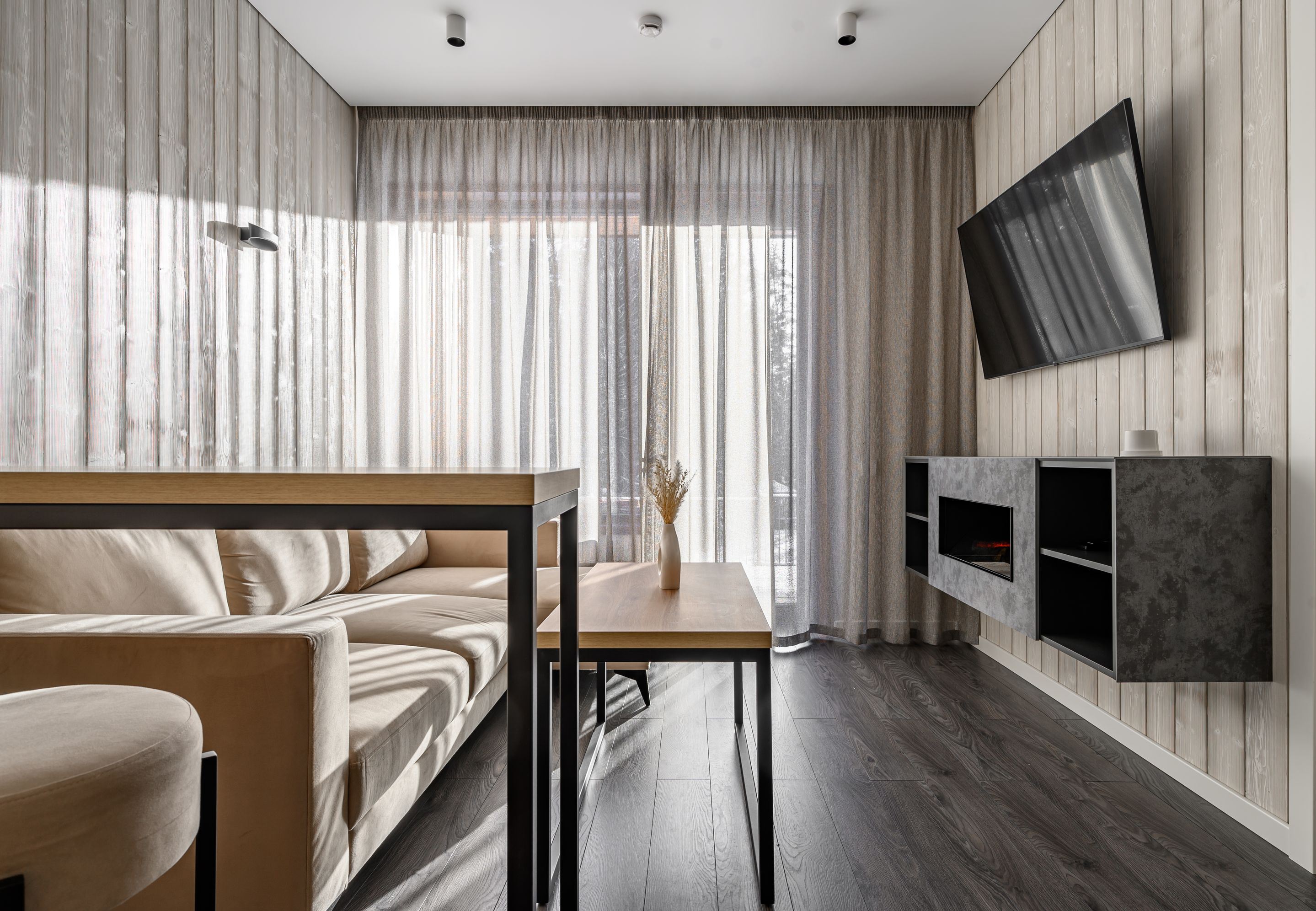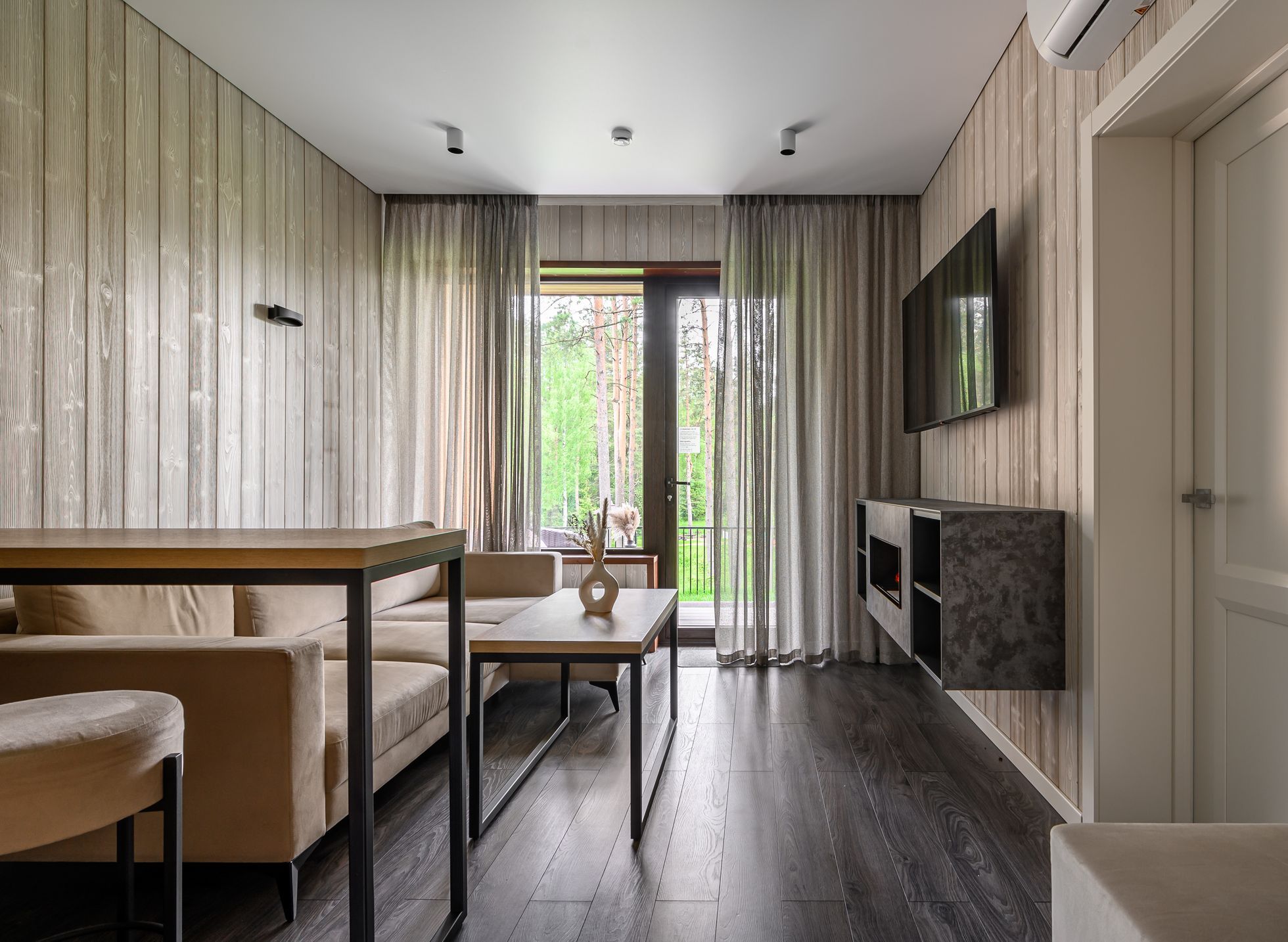 Новые светлые апартаменты исполнены в современном скандинавском дизайне и сочетают эстетику и функциональность. Планировка гармонично объединяет кухню-гостиную с камином и мягкой мебелью, две отдельные спальни и открытую террасу. Панорамные окна наполняют пространство мягким естественным светом и открывают завораживающий вид на хвойный лес.