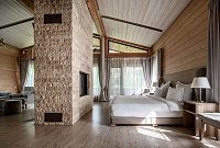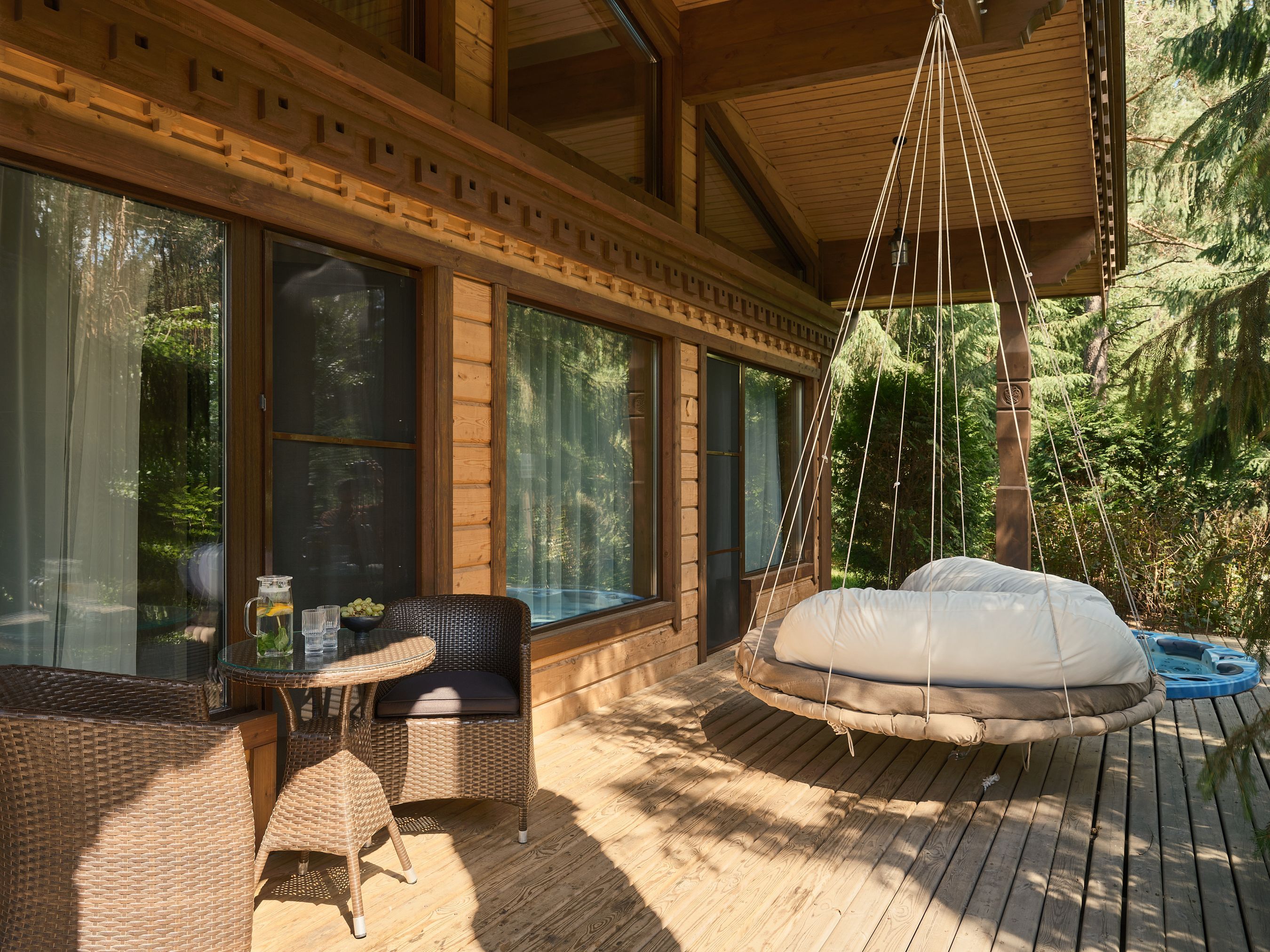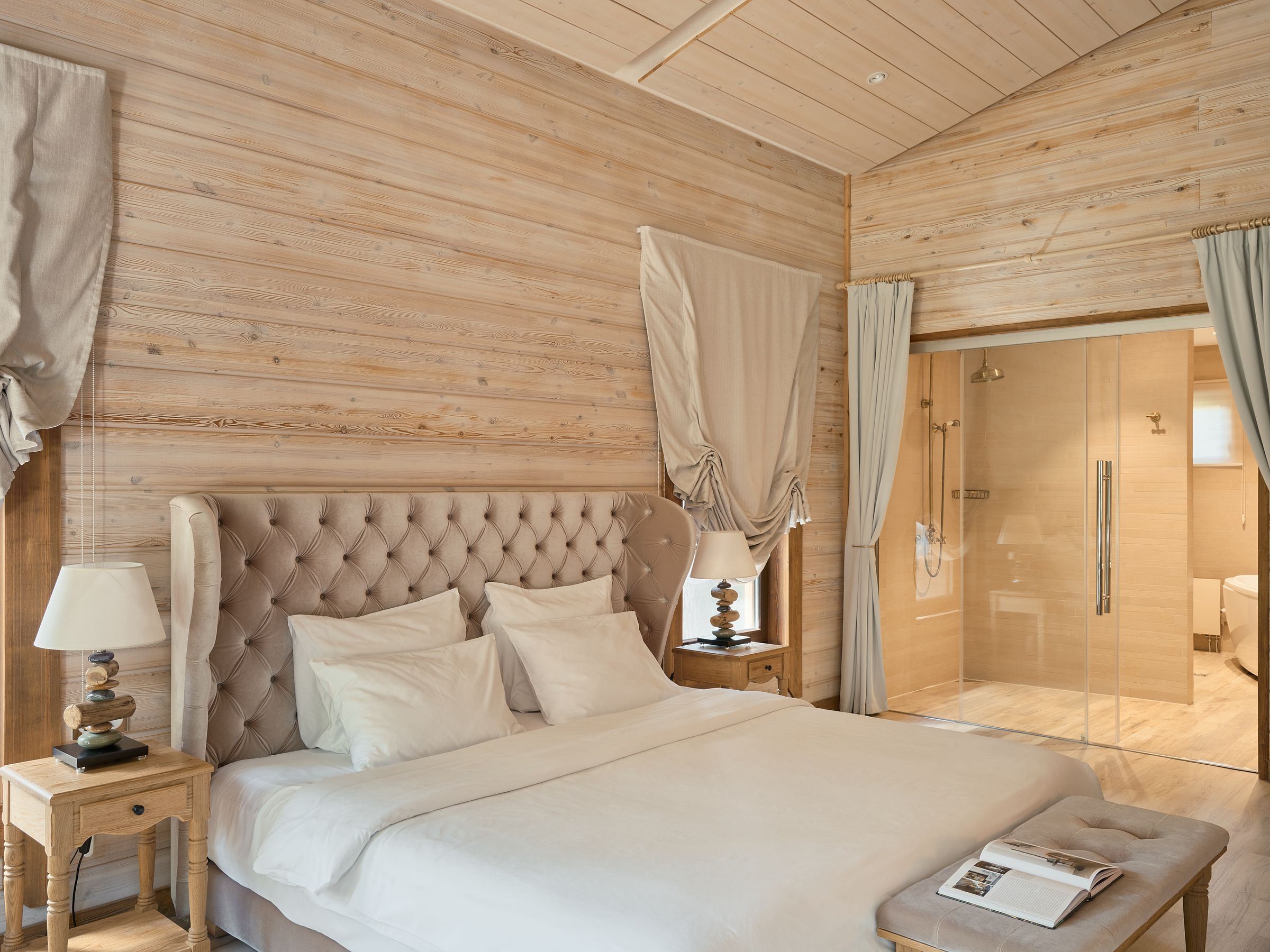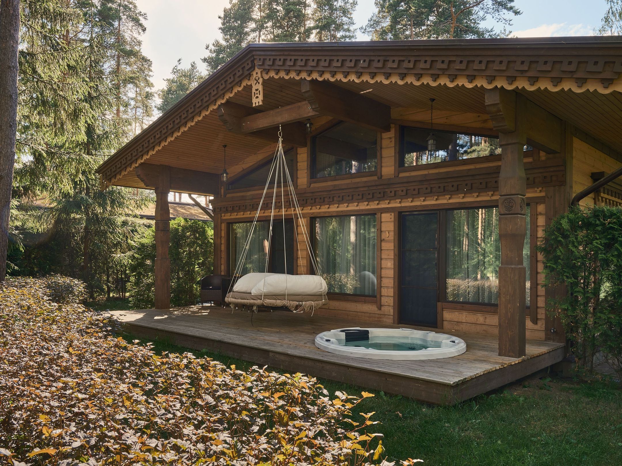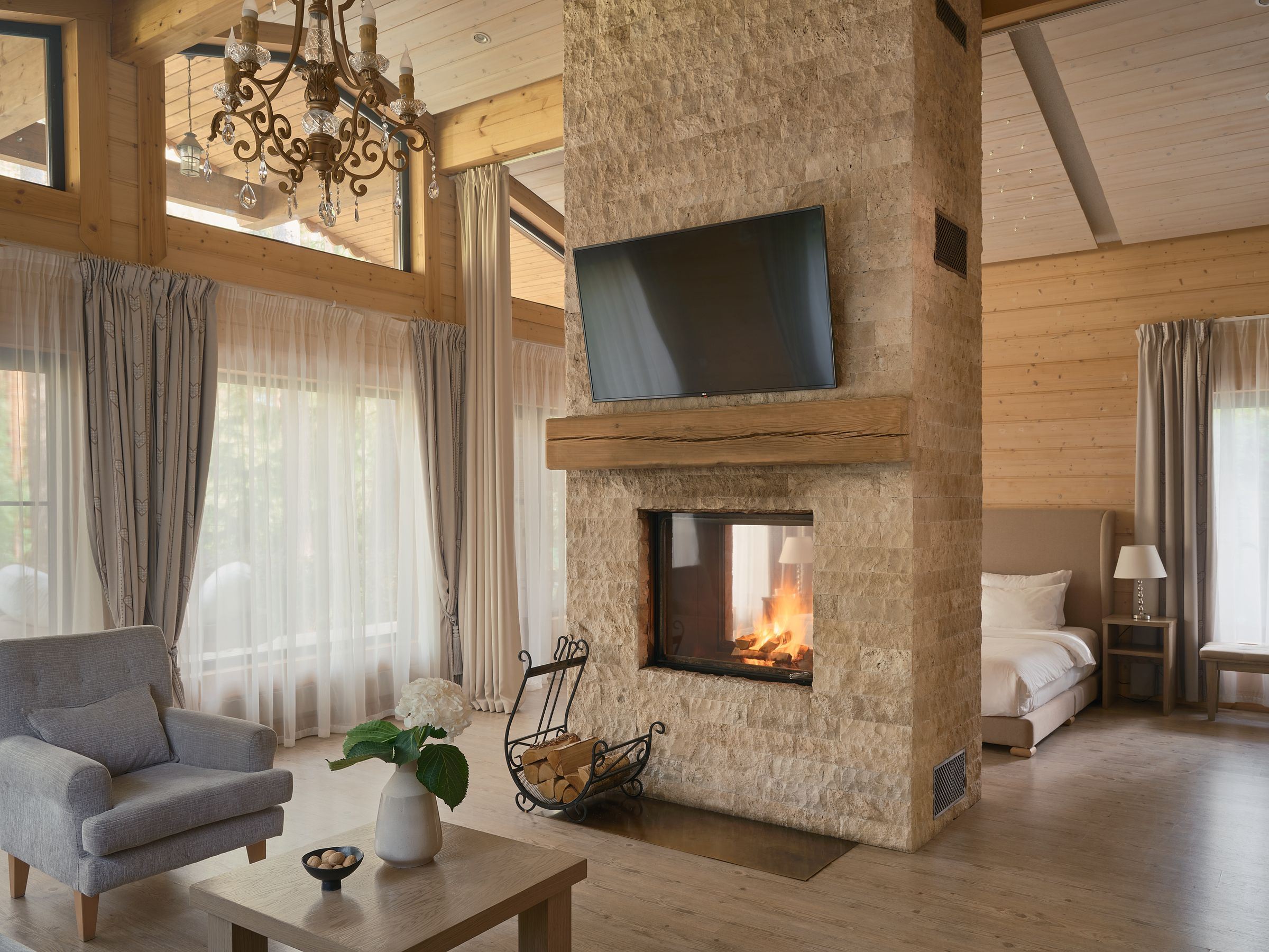 Роскошные двухместные шале для непревзойденного отдыха обладают просторными планировками и продуманным наполнением: кровать king size, декоративная подсветка «звездное небо», двусторонний камин. На открытой террасе можно отдохнуть в джакузи. наслаждаясь панорамным видом на лес.