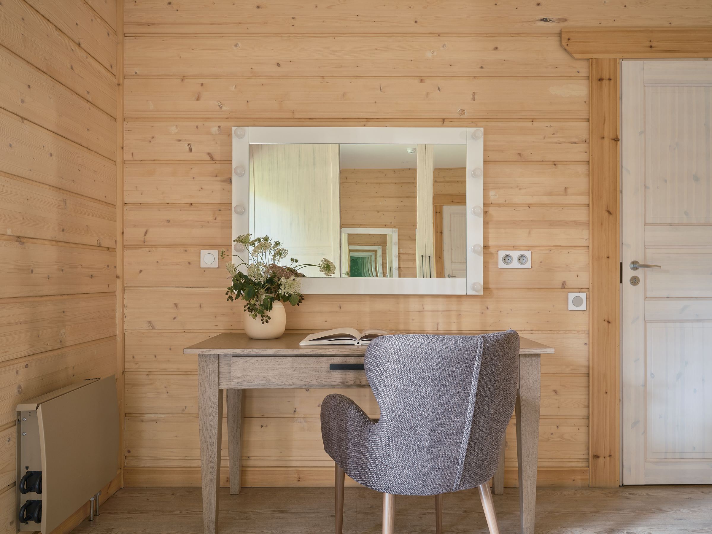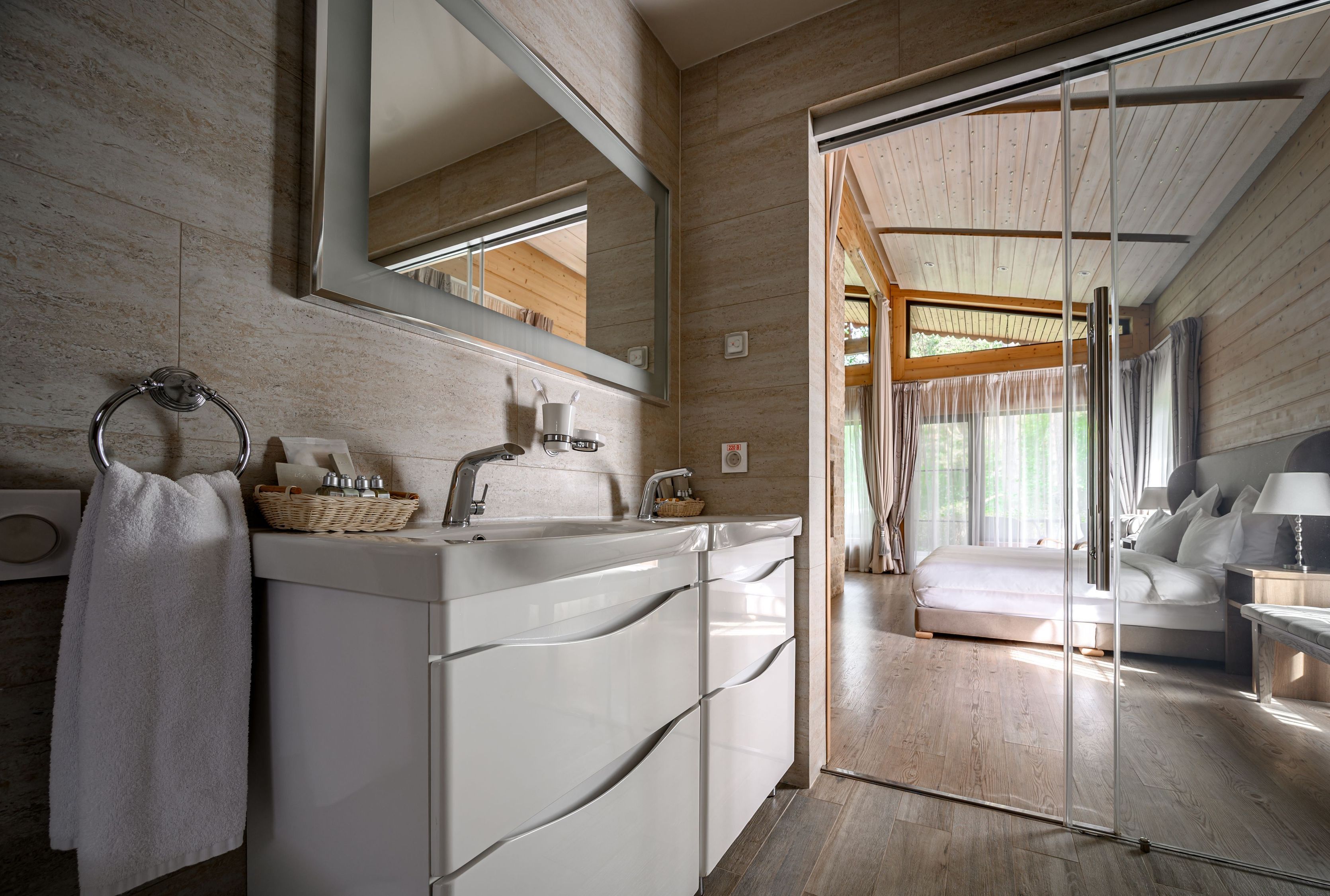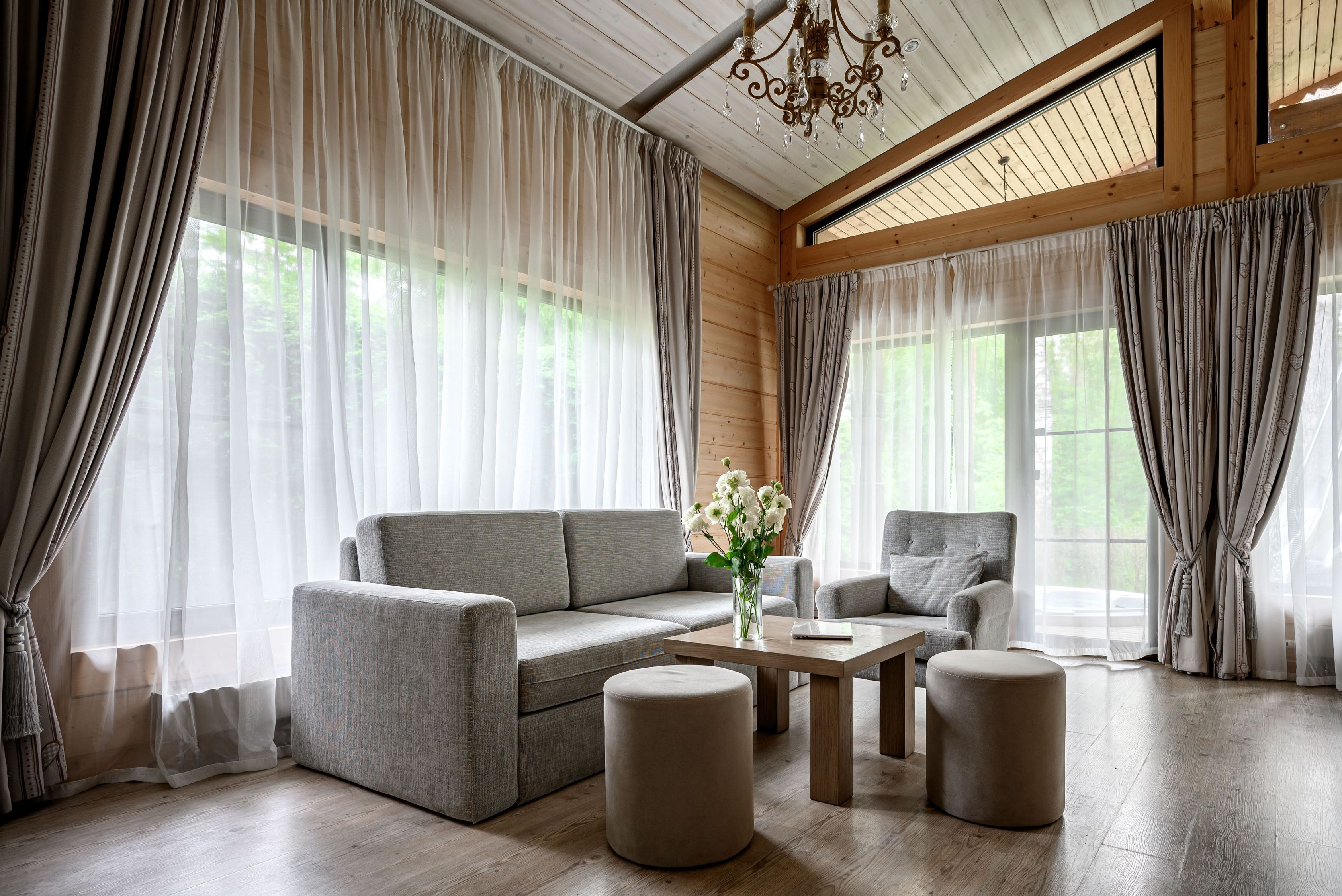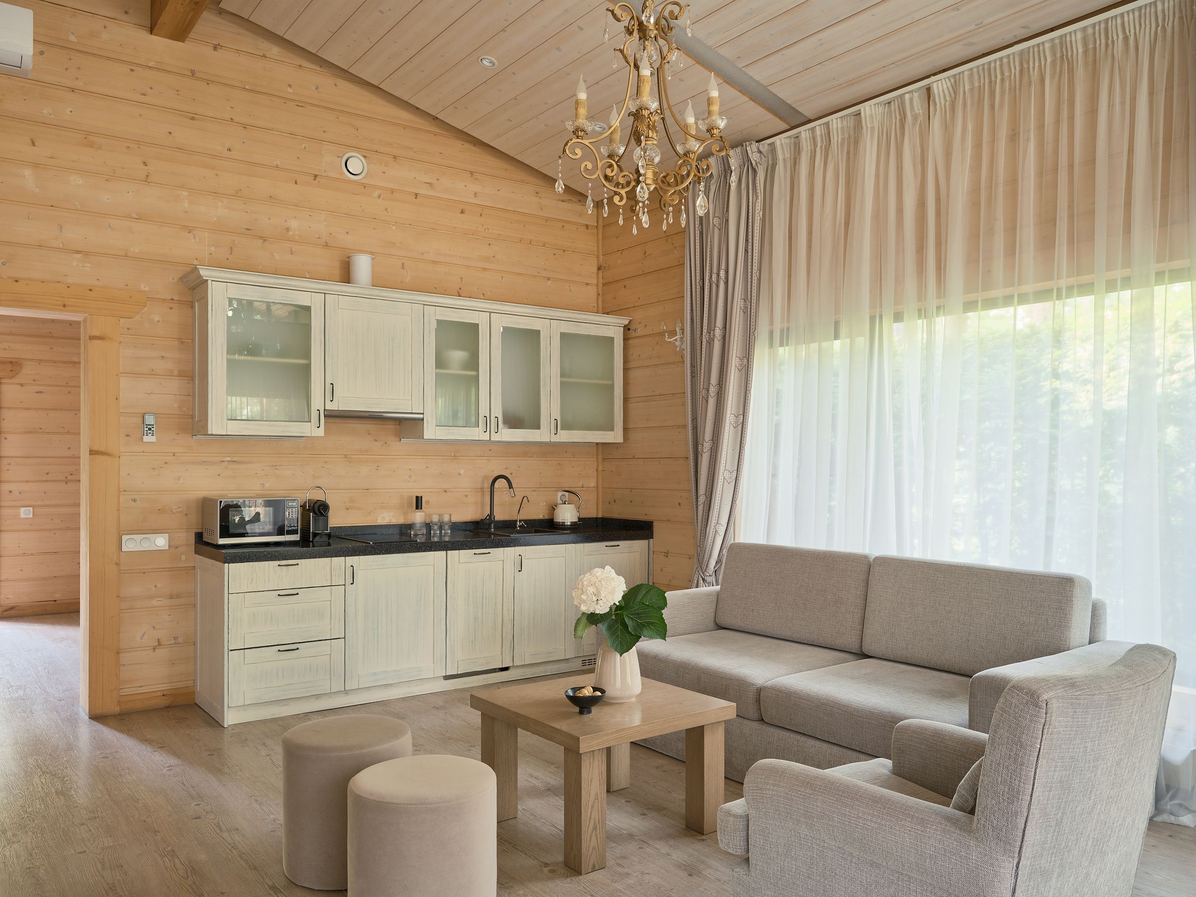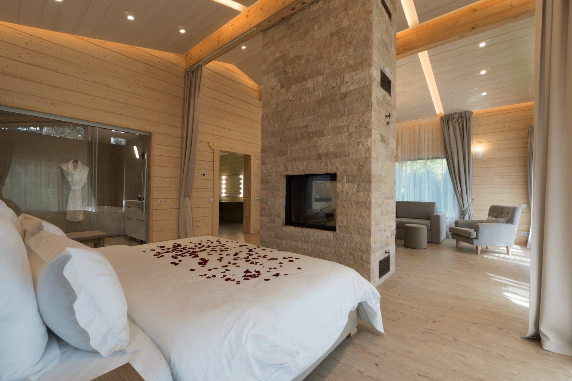 Роскошные двухместные шале для непревзойденного отдыха обладают просторными планировками и продуманным наполнением: кровать king size, декоративная подсветка «звездное небо», двусторонний камин. На открытой террасе можно отдохнуть в джакузи. наслаждаясь панорамным видом на лес.