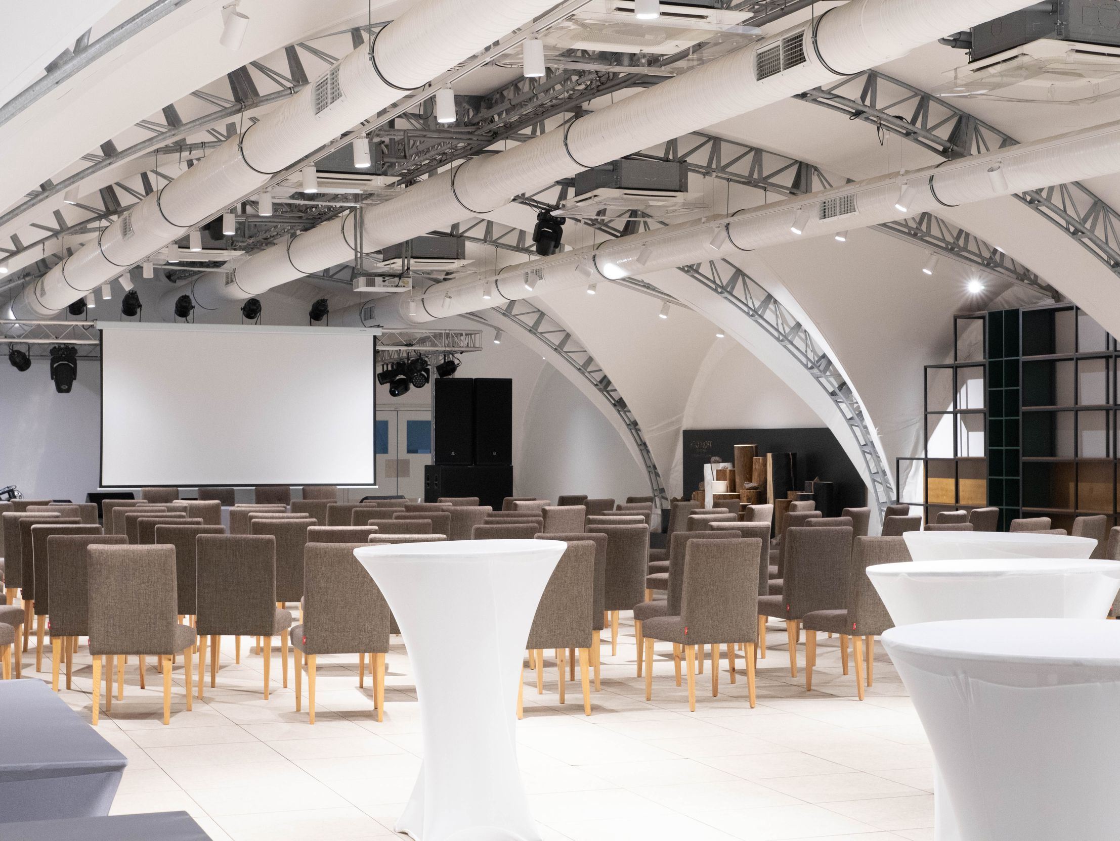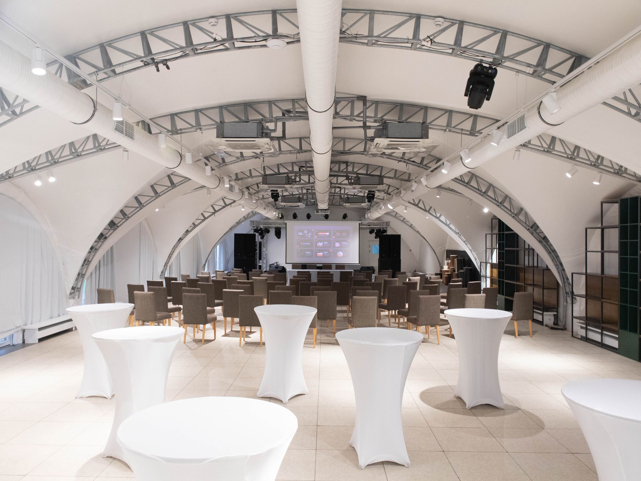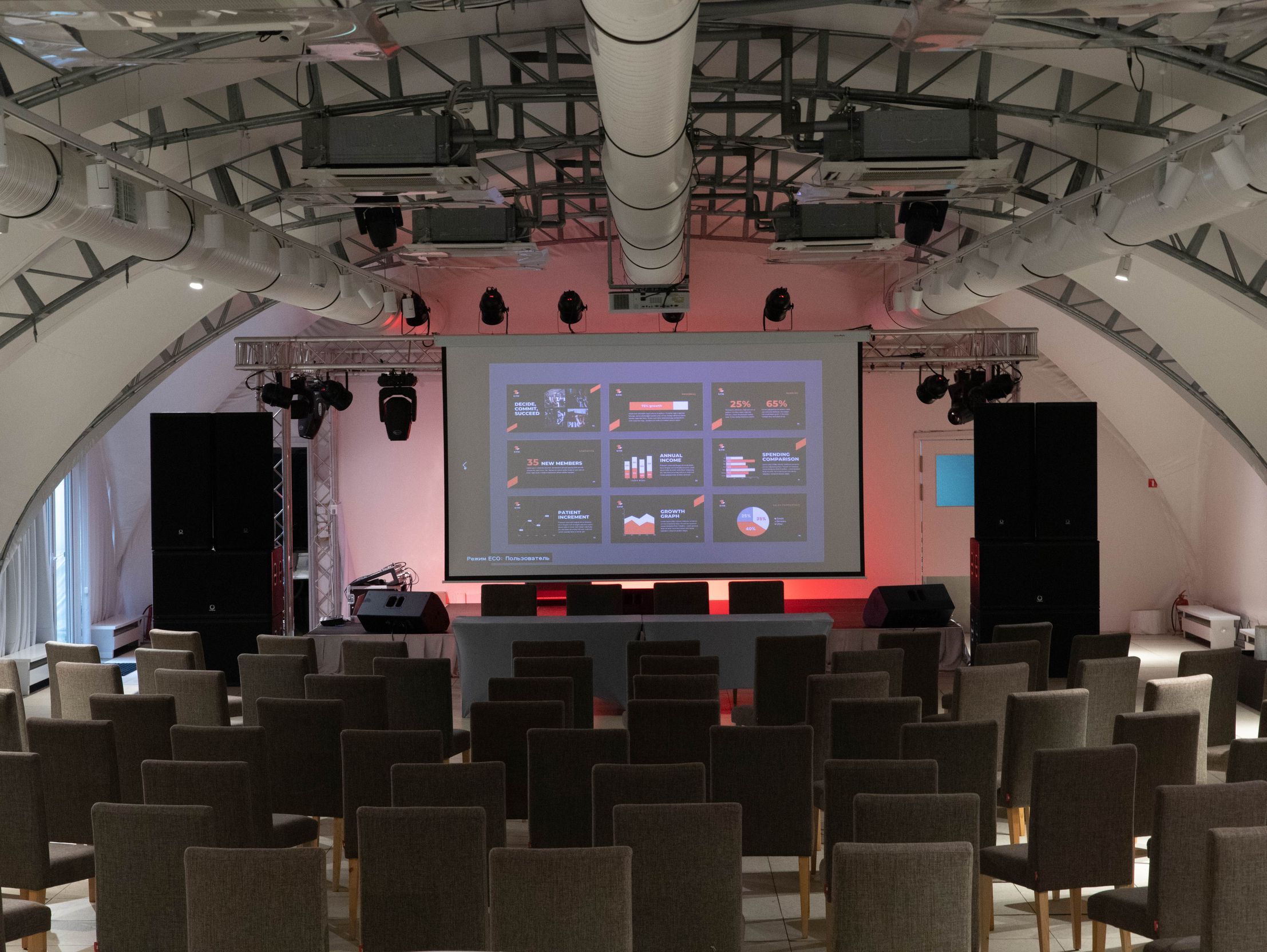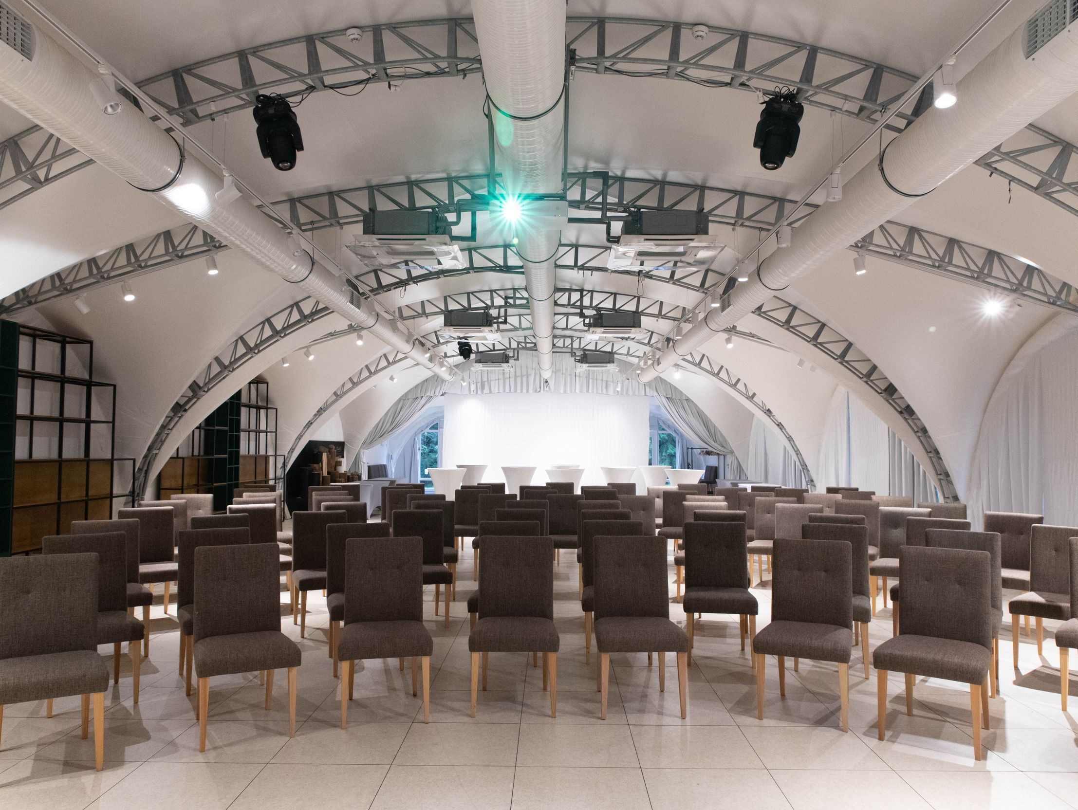 Зал большой вместимости с панорамным видом и выходом к склону. Оборудован звуковым, световым, сценическим оборудованием и сценой, отдельные туалетные комнаты