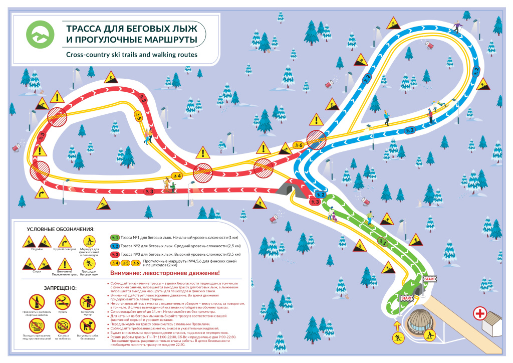 Трасса начинается в конце главной аллеи. Обращаем внимание, что на ней действует правило левостороннего движения. В целях безопасного катания просим вас также соблюдать требования разметки, знаков и указателей.